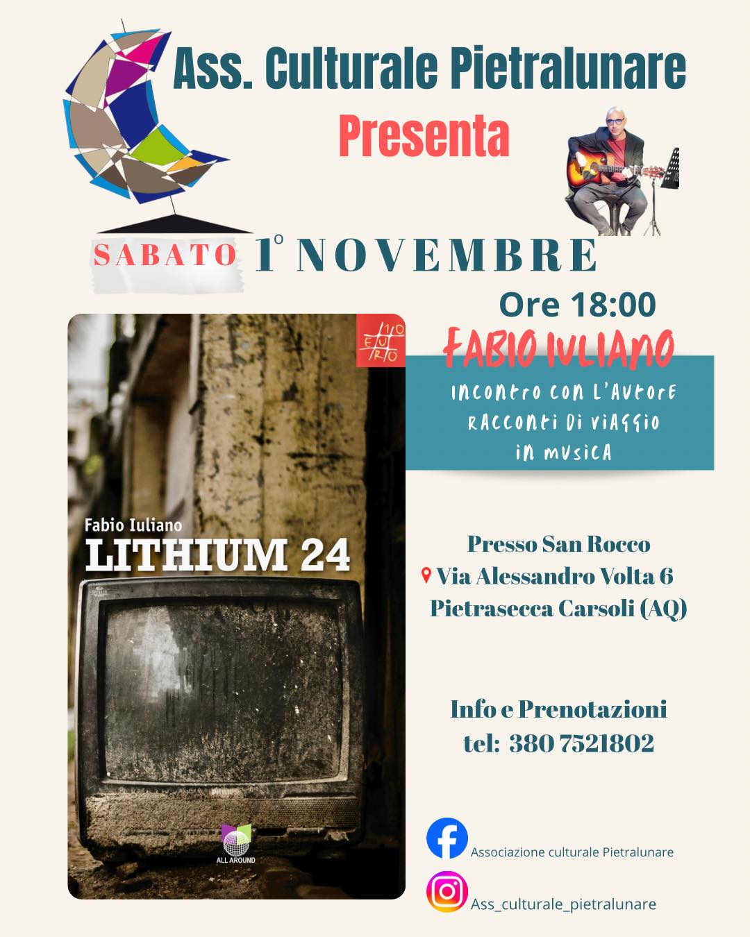 PIETRASECCA DI CARSOLI (AQ), 1° novembre 2025 – L’Associazione Culturale Pietralunare presenta un nuovo appuntamento dedicato alla letteratura e alla musica: l’incontro con l’autore Fabio Iuliano, che sabato 1° novembre 2025, alle ore 18:00, presso San Rocco – Via Alessandro Volta 6, a Pietrasecca di Carsoli, presenterà il volume “Lithium 24 – Racconti di viaggio in musica”.