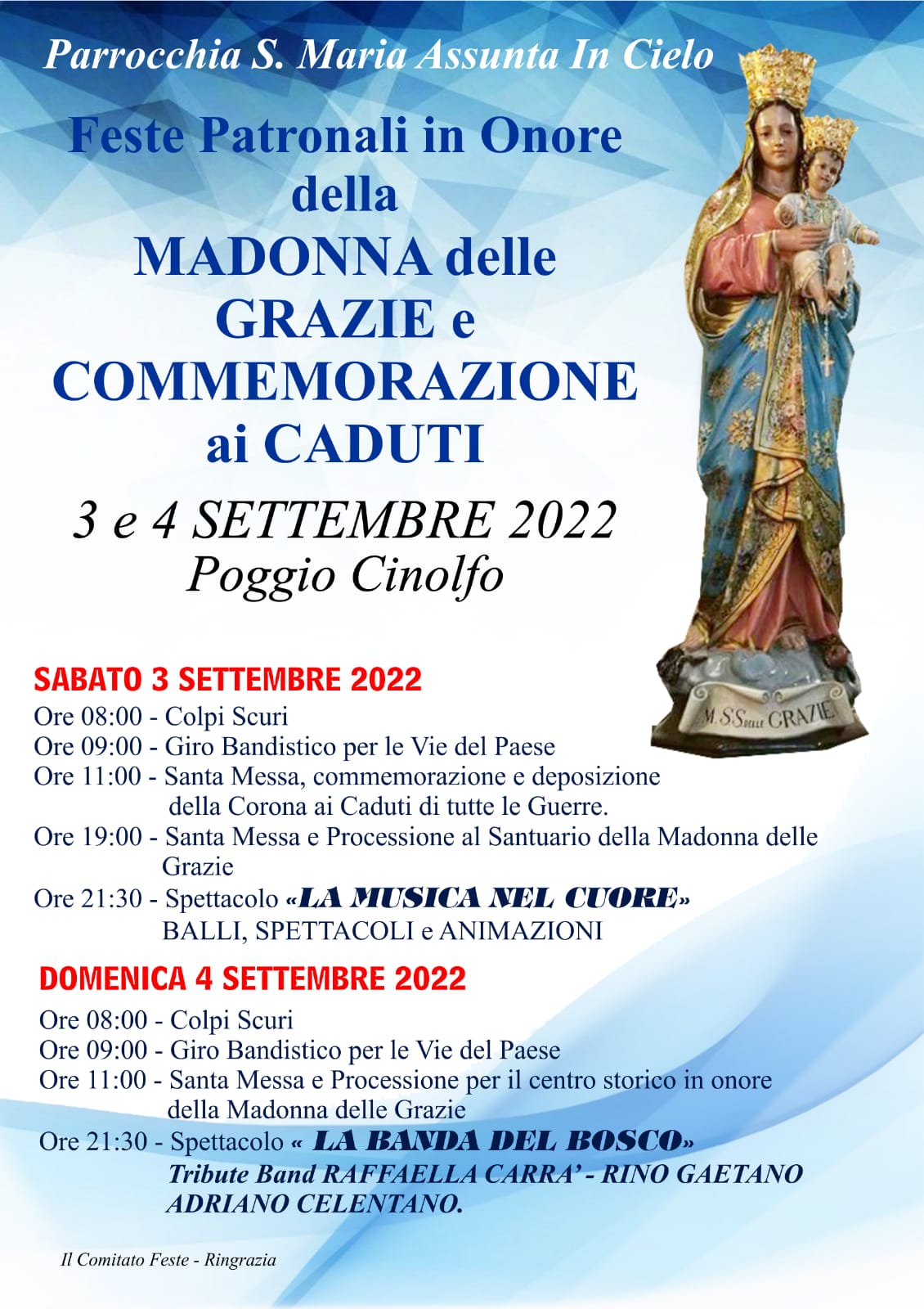 POGGIO CINOLFO – Al via la duegiorni di festività nel bel borgo di Poggio Cinolfo. Il comitato in collaborazione con la Parrocchia di Santa Maria Assunta in Cielo ha reo noto il programma delle feste patronali in onore della Madonna delle Grazie, con particolare attenzione alla commemorazione dei caduti di guerra. Serate di intrattenimento e diverse le iniziative che caratterizzano i due giorni. Di seguito il dettaglio evento: