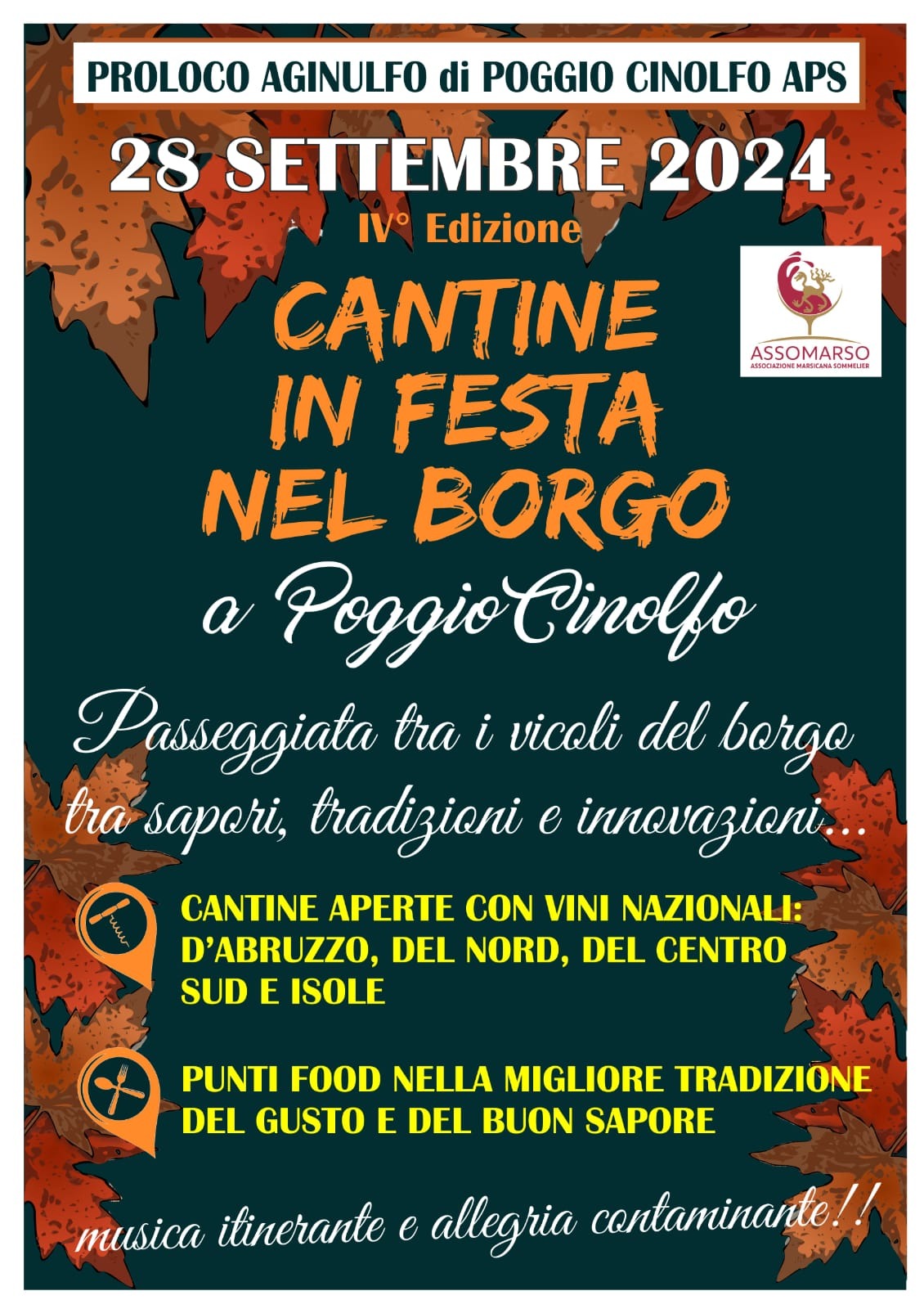 POGGIO CINOLFO – Appuntamento in grande stile a Poggio Cinolfo per sabato 28 settembre 2024 con la quarta edizione delle Cantine in festa nel borgo. Un evento che ha fatto riscontrare crescente successo nelle precedente tre edizioni. Di seguito il dettaglio locandina