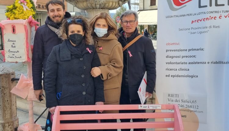 RIETI – Una panchina rosa per riflettere e sensibilizzare sulla realtà femminile e sulla prevenzione delle malattie che colpiscono le donne. E’ l’iniziativa in corso in Piazza Vittorio Emanuele II, denominata “Un pensiero per la donna”, organizzata dall’ Assessore ai Servizi Sociali, Giovanna Palomba Assessore Comune di Rieti , in accordo con la sezione Lilt Rieti