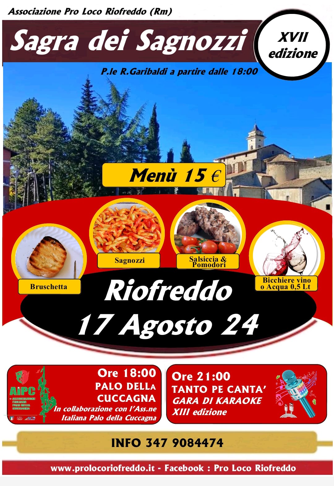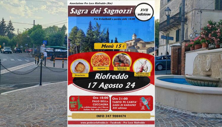 RIOFREDDO – Appuntamento questa sera con il buongusto, convivialità e tanta voglia di stare insieme in musica e divertimento nel cuore del borgo. Giunta alla sua XVII edizione la Sagra dei Sagnozzi attende tutti  dalle ore 21.00, preceduto dal Palo della Cuccagna, uno dei giochi popolari più amati da sempre. Di seguito il dettaglio evento:
