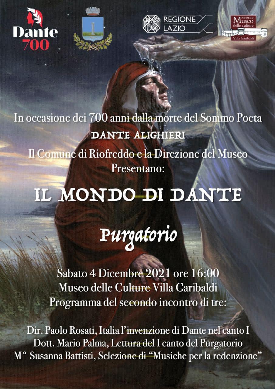 Riofreddo – Nella suggestiva cornice del Museo delle Culture Villa Garibaldi torna protagonista la cultura con un nuovo appuntamento: sabato 4 dicembre 2021 alle ore 16 secondo appuntamento con la divina Commedia: Il Purgatorio. Si tratta di iniziative organizzate in occasione dei 700 anni della morte del sommo poeta Dante Alighieri.