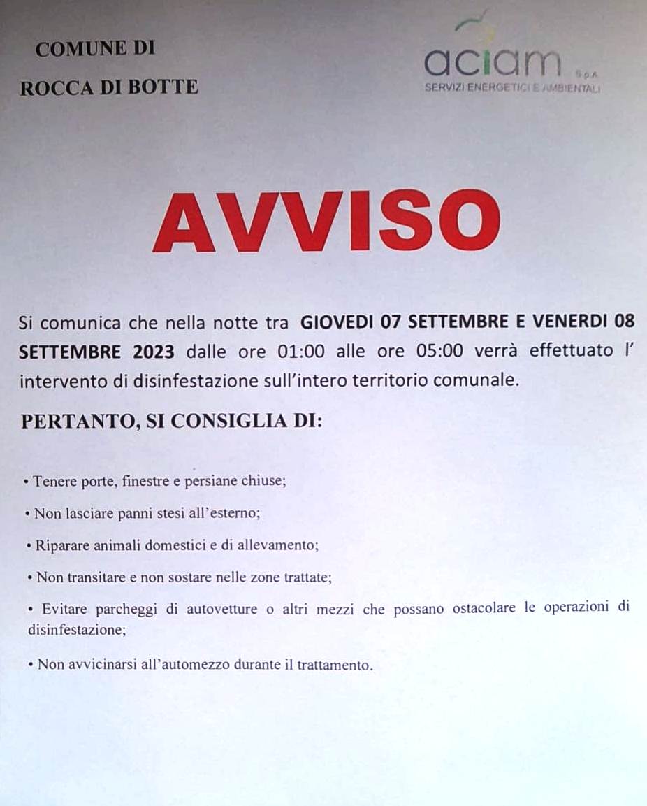 ROCCA DI BOTTE – Di seguito i dettagli diramati dal comune di Rocca di Botte per la disinfestazione  settembre 2023: