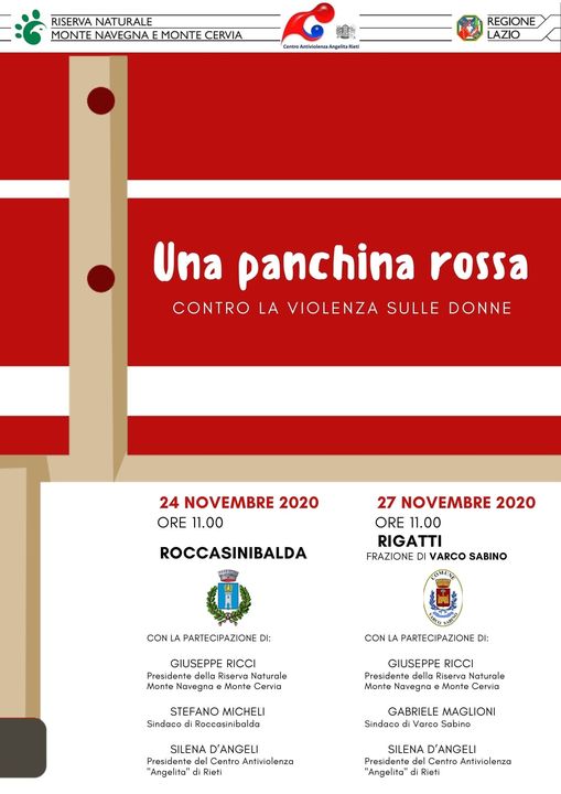 D’intesa con il centro antiviolenza Angelita di Rieti, presieduta da Silena D’Angeli ha organizzato ben due appuntamenti: il 24 novembre a Roccasinibalda e il 27 a Rigatti frazione di Varco Sabino saranno istallate due panchine rosse per ricordare l’impegno antiviolenza.