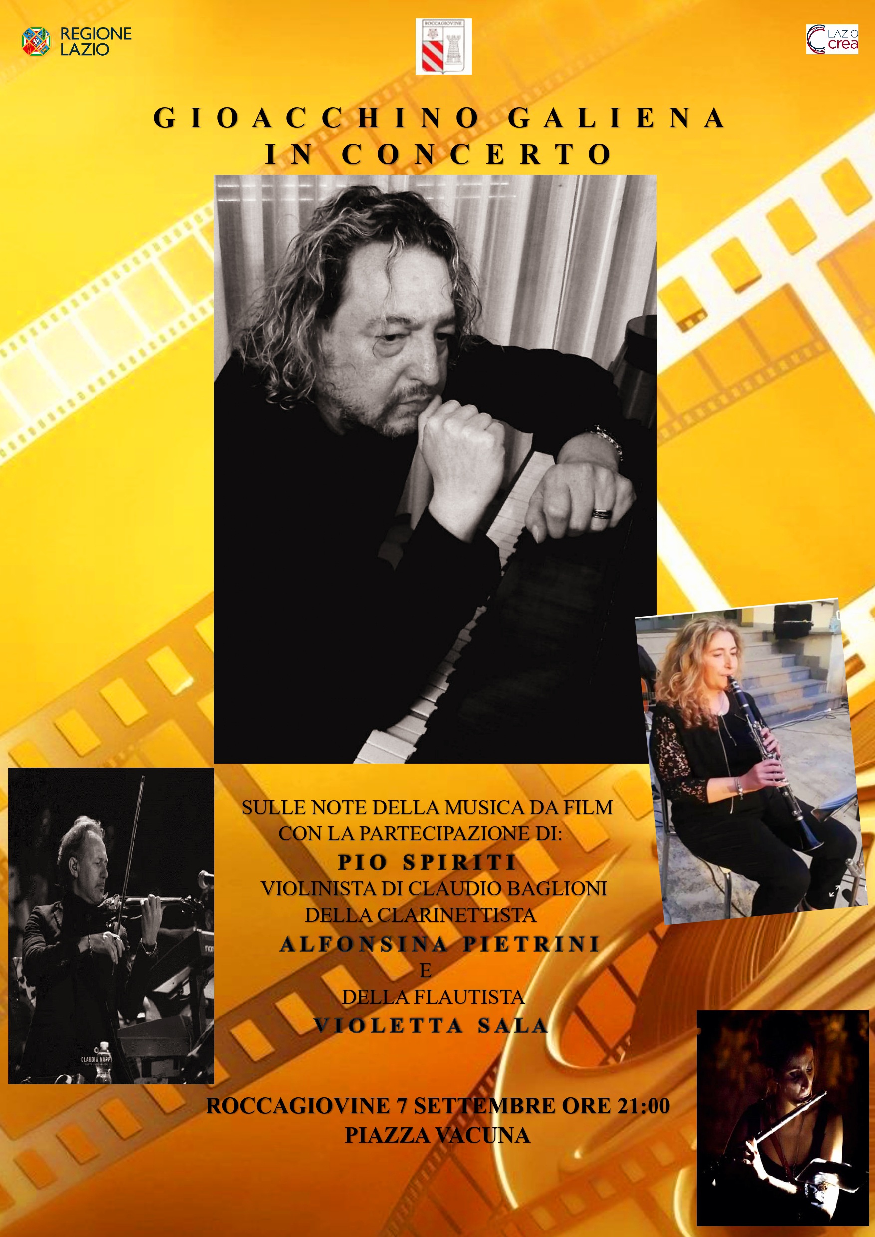 ROCCAGIOVINE – L’ evento molto atteso nel bel borgo  è GIOACCHINO GALIENA IN CONCERTO. Save the date  7 settembre ore 21.00.Nell’incantevole borgo di Roccagiovine immerso nella caratteristica Valle dell’Aniene e nel cuore del Parco Regionale dei Monti Lucretili riecheggiano musiche da film da Ennio Morricone a Nicola Piovani. GIOACCHINO GALIENA IN CONCERTO 7 settembre ore 21.00 Piazza Vacuna. Di seguito il dettaglio evento:
