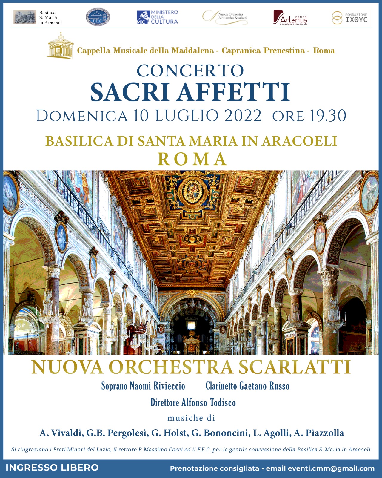 Roma – Tornano a risuonare le note della grande musica con il concerto della Nuova Orchestra Scarlatti di Napoli diretta dal maestro Alfonso Todisco che rientra nell’ambito della stagione concerti 2022 organizzata dalla Cappella Musicale della Maddalena di Capranica Prenestina sotto la guida del parroco del paese don Davide Martinelli che ancora una volta mostra tutto il suo impegno per portare la cultura nel borgo prenestino. Anche quest’anno la Nuova Orchestra Scarlatti di Napoli sarà protagonista di un evento eccezionale di grande rilevanza che si svolgerà nella basilica di Santa Maria di Aracoeli a Roma. All’interno della basilica riecheggeranno le note messe su pentagramma da grandi musicisti come Vivaldi, Pergolesi, Holst, Bononcini, Agolli e Piazzolla con il clarinetto di Gaetano Russo e la voce della soprano Naomi Rivieccio a completare la serata che prende il nome di Sacri Affetti. ” La musica classica che si fonde con la fede – esordisce così il consigliere di Capranica Prenestina Carlo Spinelli responsabile provinciale romano del movimento Italia dei Diritti nel commentare l’iniziativa di don Davide – è questo quello che riesce a coniugare il parroco del borgo prenestino don Davide Martinelli con le sue iniziative culturali che ogni anno portano l’arte in ogni sua forma a Capranica Prenestina.