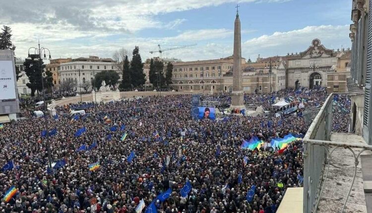 L’iniziativa del giornalista Michele Serra, per chiedere più Europa, ha richiamato a piazza del Popolo migliaia di persone, 25mila secondo il presentatore Claudio Bisio. E probabilmente sarebbero potute essere molte di più. In molti infatti sono rimasti fuori bloccati dalle forze dell’ordine. Per motivi di sicurezza sono stati chiusi i varchi dopo un’ora circa dall’inizio. Una piazza così gremita effettivamente non si vedeva da tempo, bandiere blu dell’Unione europea, bandiere della pace, dell’Ucraina, della Georgia, un paio anche della Palestina – quasi mai menzionata dal palco – e nessuna di partito come richiesto dagli organizzatori, hanno colorato la manifestazione.