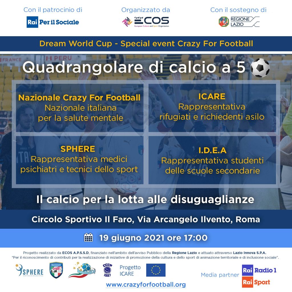Roma – La Nazionale Italiana Crazy For Football torna in campo dopo la pausa forzata per un quadrangolare di calcio a cinque davvero speciale. Teatro dell’iniziativa, sabato 19 giugno a partire dalle ore 17, è il Circolo sportivo ‘Il Faro’, in via Arcangelo Ilvento a Roma, dove si disputerà la ‘Dream World Cup – Special Event Crazy for Football’, manifestazione nata con l’obiettivo di dare un calcio alle disuguaglianze e mettere al centro lo sport come strumento di cura, inclusione, integrazione e speranza per le persone fragili. Protagoniste di questo evento all’insegna della solidarietà sarà appunto la ‘Nazionale Crazy For Football’, la Nazionale Italiana di calcio a cinque per persone con problemi di salute mentale, che incontrerà gli ‘I-CARE’, una rappresentativa di rifugiati e richiedenti asilo a cura della Asl Roma 1 e del centro Samifo, gli ‘Sphere’, una rappresentativa di medici psichiatri e tecnici dello sport e, infine, ‘L’IDEA’, una rappresentativa di studenti delle scuole secondarie di Roma.