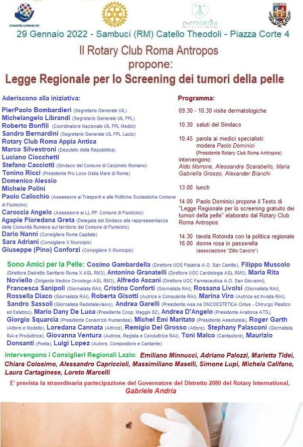 In sostanza, come spiega Canale 10 – si tratta di una importante iniziativa in cui si darà risalto al progetto che il Rotary presenterà al consiglio regionale del Lazio, in condivisione con l’associazione Oncoestetica Onlus concernente la proposta per la realizzazione di una legge regionale – che consta di combinato disposto e di testo – per dare ai cittadini della Regione Lazio la possibilità di prevenire e curare i tumori della pelle mediante screening gratuiti, l’utilizzo di una apposita banca dati, la telemedicina, cure specialistiche, sperimentazioni e chirurgia.