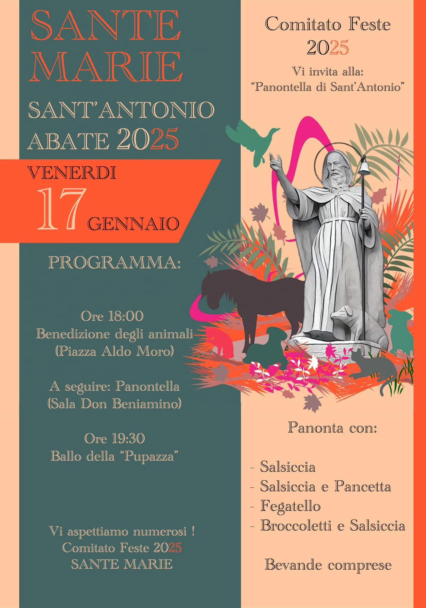 SANTE MARIE – Tradizione e tanta voglia di stare insieme. L’appuntamento a Sante Marie è per Venerdì 17 gennaio 2025, organizza il comitato Feste 2025. Così il sindaco Lorenzo Berardinetti sui social: Comitato feste Sante Marie, in occasione della festa di Sant’Antonio, ha invitato tutti i nostri bimbi a partecipare al loro evento, offrendo a tutti un buono pasto da utilizzare la sera del 17 gennaio per l’acquisto di un panino!