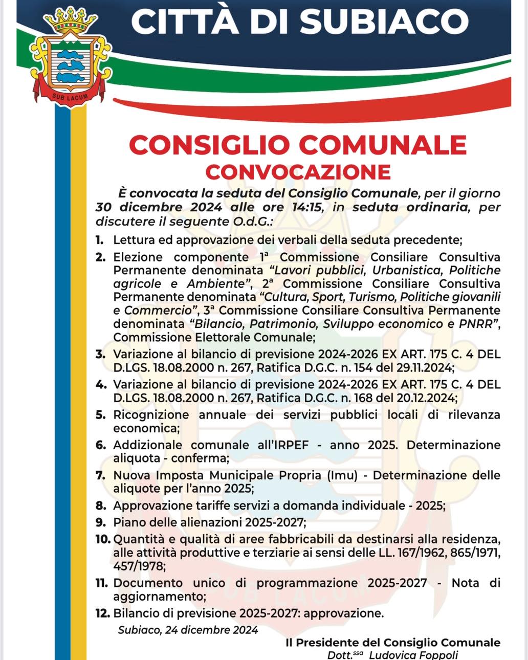 SUBIACO – Seduta fiume di fine anno al comune di Subiaco: la convocazione per il giorno 30 dicembre 2024 alle ore 14.15 prevede una lunga fase approvazione atti. Di seguito il dettaglio: