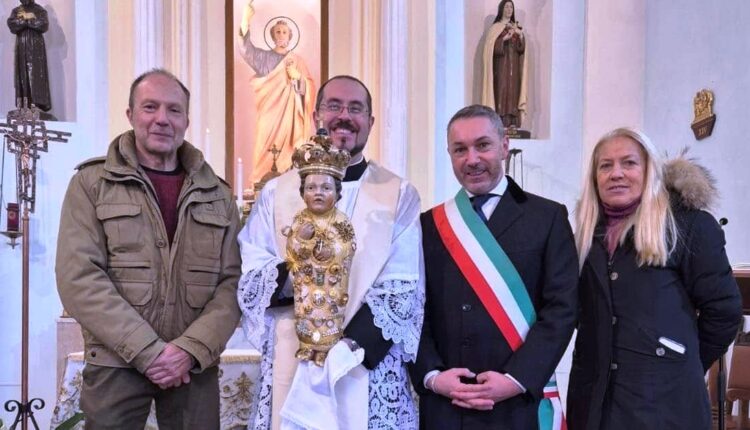 Tagliacozzo – Ieri la Comunità di Tagliacozzo, per iniziativa del  Parroco d. Ennio Grossi, ha avuto la grazia di accogliere il Bambinello dell’Ara Cœli, molto venerato a Roma e in tutto il mondo. Scortato dal Ministro provinciale dell’Ordine dei Frati minori, il molto rev. P. Luciano De Giusti e dal rev. P. Massimo Cocci, Rettore della Basilca di Santa Maria dell’Ara Cœli, la piccola Statua è giunta a Porta Valeria da dove è stata condotta processionalmente nella Chiesa di San Pietro. Dopo la santa Messa, il corteo, accompagnato dai membri della Confraternita di Sant’Antonio Abate, dal Comandante della Polizia locale Paolo Pascucci l, dal Presidente Filippo Di Mastropaolo e dai membri dell’Associazione italiana dei Carabinieri, ha condotto il Bambinello nel Monastero delle Monache benedettine dei Santi Cosma e Damiano dove si è svolto un breve momento di preghiera. Di qui, alle ore 15.00 la sacra Immagine sarà condotta nel presidio sanitario dell’Umberto I per la benedizione ai malati. Al termine, alle ore 17.00 nella Chiesa della Santissima Annunziata ove riceverà l’omaggio di tutti gli altri fedeli che questa mattina non hanno potuto partecipare alle cerimonie di accoglienza in Alto la Terra. Quindi il Bambinello sarà ricondotto da P. Luciano e da P. Massimo a Roma. E’ stato reso testualmente noto dal sindaco Vincenzo Giovagnorio sui social.