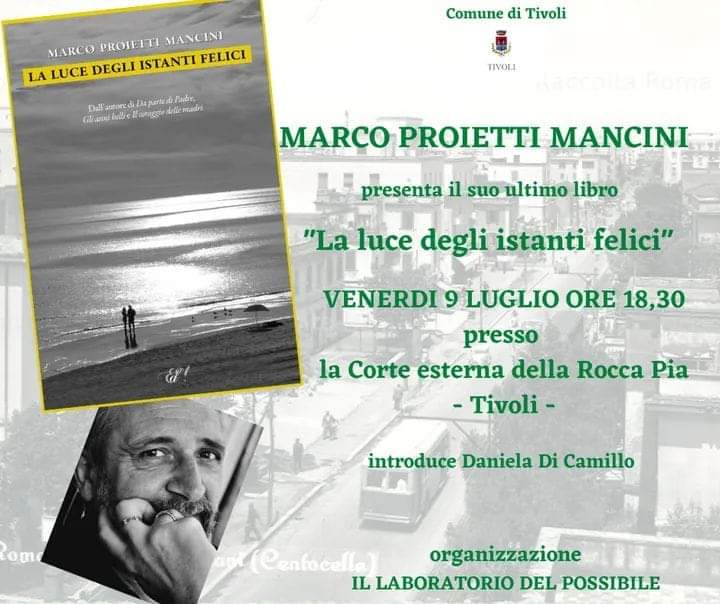 Tivoli– Sarà presentato venerdì 9 luglio alle 18,30 nel giardino della Rocca Pia l’ultimo libro dello scrittore Marco Proietti Mancini“La luce degli istanti felici” (editore: Edizioni della sera).