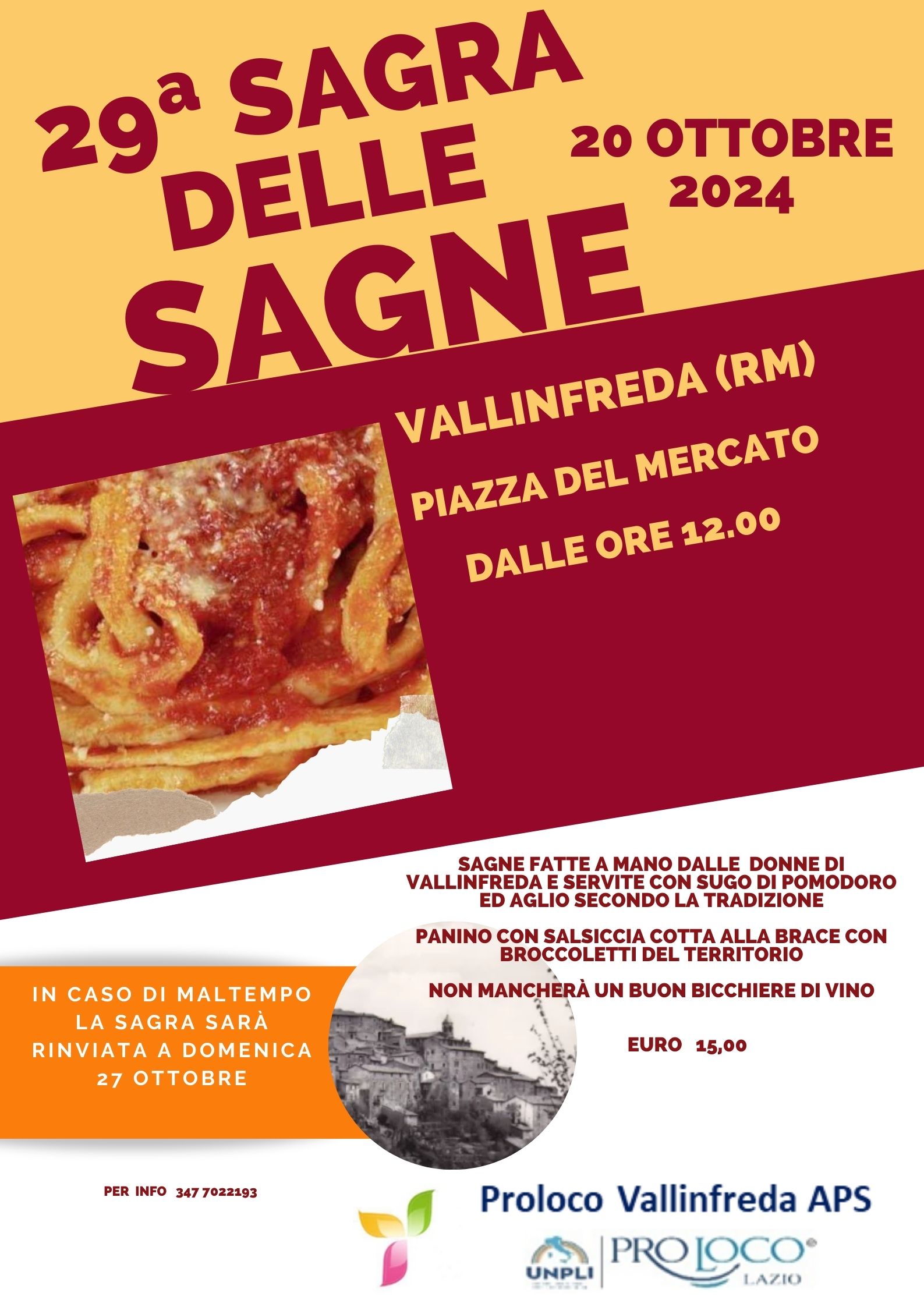 VALLINFREDA – L’appuntamento con il buon gusto e la convivialità è per domenica 20 ottobre 2024: dalle ore 12 via alla ventinovesima edizione della sagra delle Sagne. Bella la cornice del borgo particolarmente accogliente. Di seguito la locandina con dettaglio evento. L’organizzazione è curata dalla ProLoco.