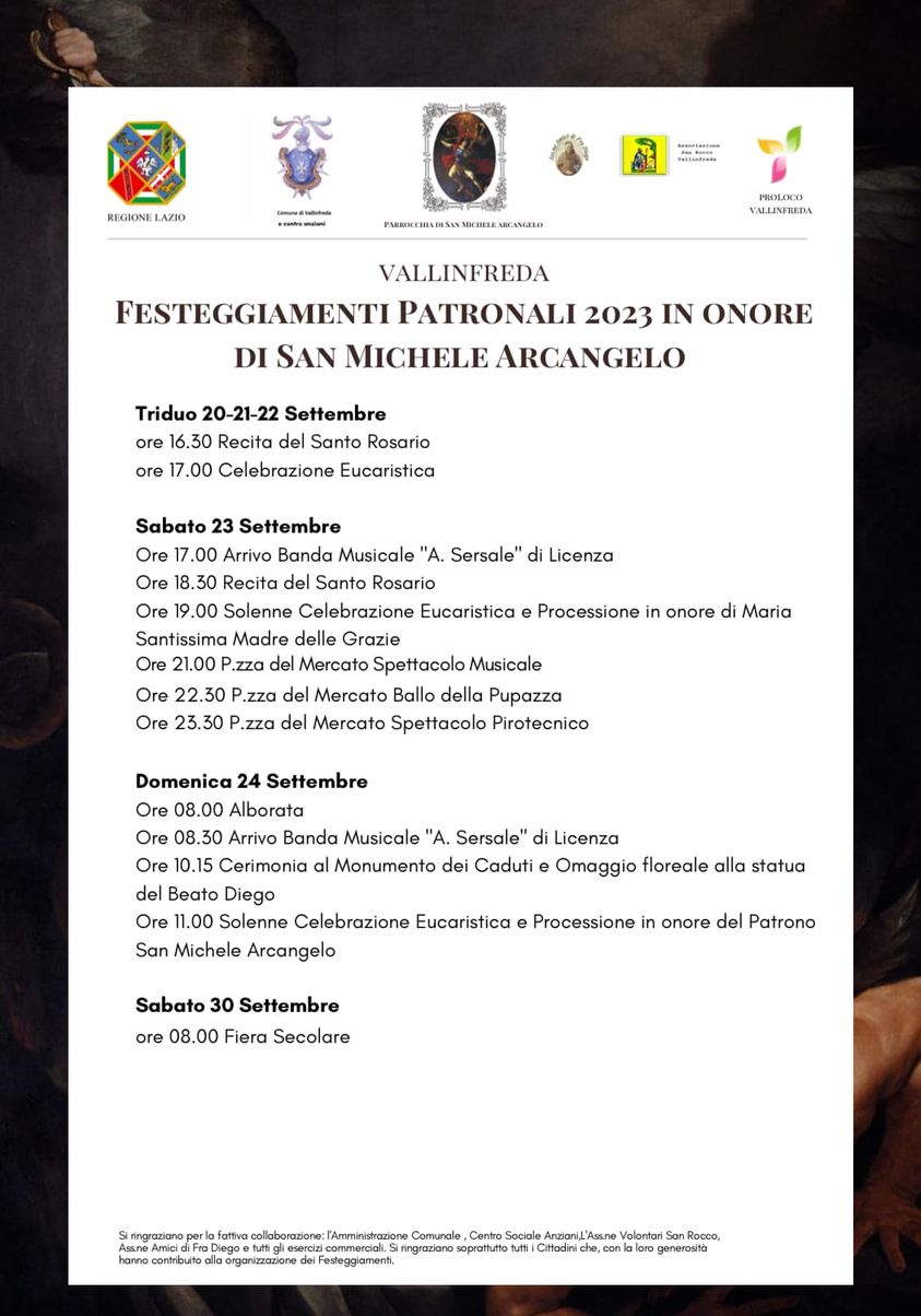 VALLINFREDA – Attesa per il fine settimana, quando da sabato 23 e fino a domenica 24 si svolgeranno i tradizionale festeggiamenti in onore del Santo Patrono Michele Arcangelo: dis eguito il dettaglio eventi: :