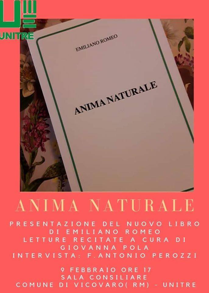 Vicovaro – Domenica 9 febbraio si terrà a Vicovaro la presentazione della silloge Anima naturale del poeta di Tivoli Emiliano Romeo. L’opera, che risente fortemente dell’attività di guida ambientale dell’autore, raccoglie testi scritti in un arco abbastanza lungo di tempo e focalizzati sul rapporto uomo-natura.