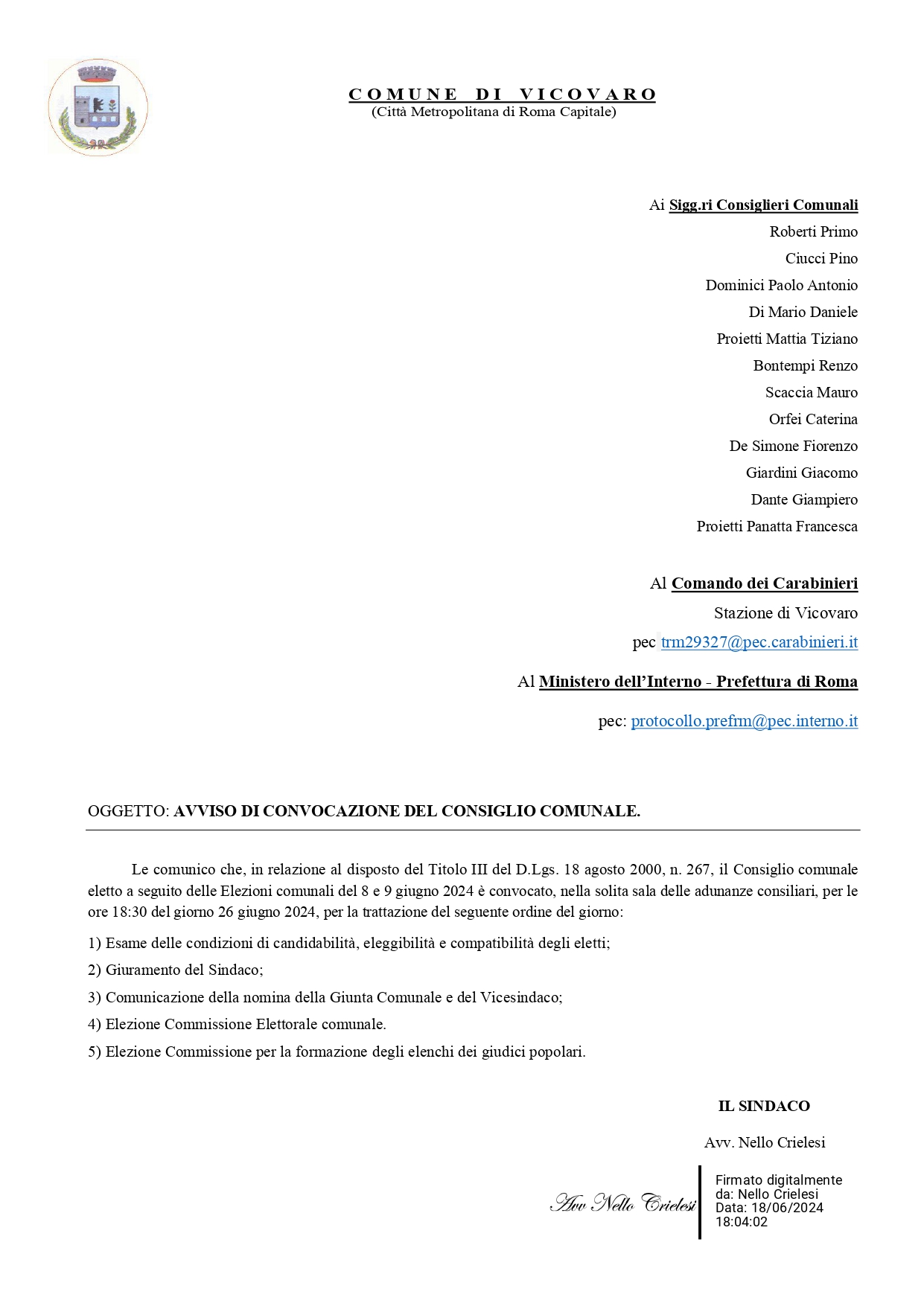 VICOVARO – E’ stata convocata la prima seduta del consiglio comunale di Vicovaro per Mercoledì 26 giugno alle ore 18.30: di seguito i punti all’ordine del giorno: