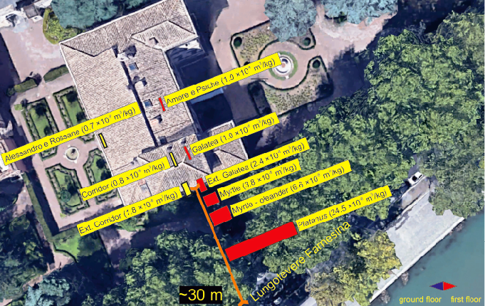 The trees along the Lungotevere and inside the Gardens of Villa Farnesina accumulate vehicular particulate matter, thus limiting their input inside the loggias and the consequent damage to Raphael’s masterpieces.