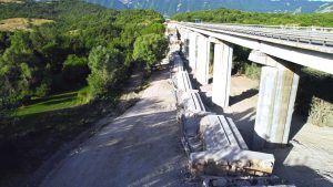 La scorsa notte l’area dell’intervento è stata evacuata nel raggio di 200 metri. Il suono del corno, come nella tradizione degli artificieri, ha dato il segnale di via all’effetto domino delle microcariche, sapientemente posizionate nei punti di indebolimento in fase preparatoria. Una quantità di esplosivo irrisoria rispetto alla mole colossale, perché la struttura viene indebolita e le microcariche inducono una torsione in speciali punti cerniera che ne facilita il collasso. Tutto è stato pianificato nei minimi dettagli nelle scorse settimane per garantire il massimo controllo e sicurezza in ogni fase. “La struttura viene attrezzata con strumenti di misurazione degli effetti indotti dalle operazioni di abbattimento e con sismografi per il monitoraggio prima, durante e dopo l’abbattimento” spiega l’ing. Ventura. “Sono inoltre previsti dispositivi di protezione per il contenimento di eventuali proiezioni di materiale”. Alle ore 5:44 di oggi la carreggiata est del Viadotto Fornaca si è accartocciata come un castello di carte. Le tempestive verifiche degli addetti alla sicurezza hanno permesso di riaprire al transito dei veicoli la carreggiata opposta nei tempi previsti, dopo sole tre ore di chiusura al traffico tra L’Aquila Ovest e Tornimparte. Nei prossimi giorni verranno rimossi i detriti del viadotto abbattuto.