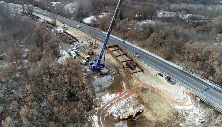 Concluse le operazioni di varo della seconda e della terza campata. Le strutture, lunghe 32 metri per circa 50 tonnellate di peso, sono state pre-assemblate in prossimità di una spalla del viadotto e trasportate già complete nella posizione di varo.