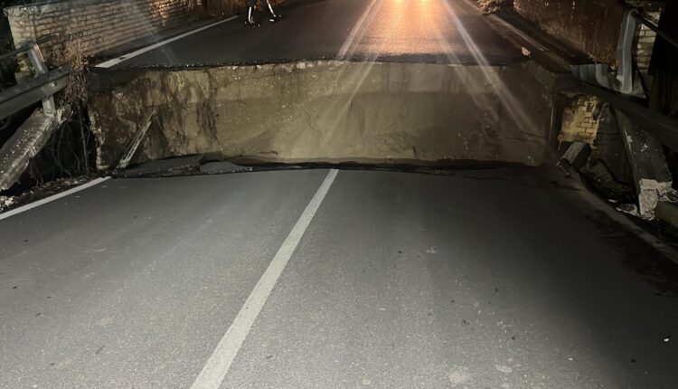 TORTORETO – Stanotte si è verificato il cedimento del ponte sul torrente Salinello lungo la strada provinciale SP12, tra i comuni di Sant’Omero e Bellante. Fortunatamente il cedimento si è verificato in un momento in cui nessuna auto stava transitando sul ponte. Potrebbe essere stato il collasso di una trave in cemento armato a determinare il cedimento del ponte sul quale era presente segnaletica per la limitazione del carico a 12,5 tonnellate.