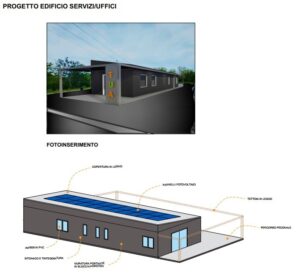 La scelta è stata quella di dotare l’area di pensiline che accolgono un efficiente impianto fotovoltaico, il quale potrà garantire il considerevole apporto di energia elettrica che permetterà di alimentare tutto il sistema di riscaldamento e raffrescamento dell’edificio, oltre a servire l’impianto di illuminazione ed il sistema di pompaggio degli impianti deputati al trattamento delle acque reflue.