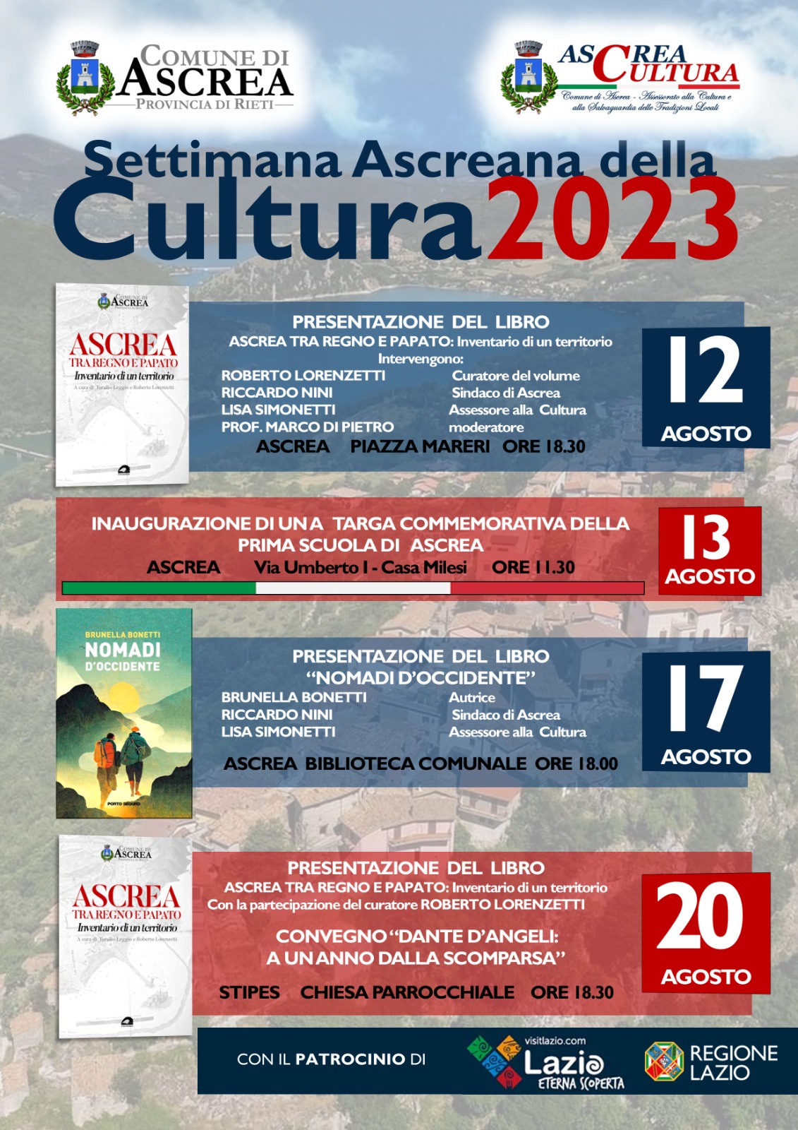 ASCREA – Per il terzo anno consecutivo, torna la Settimana Ascreana della Cultura, organizzato dall’Assessorato alla Cultura e promosso dal Comune di Ascrea, in collaborazione con la Pro Loco e le Associazioni territoriali.