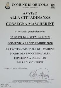 Oricola – Nel pieno della seconda ondata Covid prosegue l’impegno da parte dell’amministrazione comunale di Oricola. Il primo cittadino Antonio Paraninfi informa tutti i cittadini che sabato 14 e domenica 15 novembre il Gruppo Volontari di Protezione Civile  procederà con la sesta consegna delle mascherine chirurgiche. I dispositivi di sicurezza verranno consegnati gratuitamente a domicilio nel rispetto nelle norme anticovid a tutti i nuclei familiari residenti nel territorio.