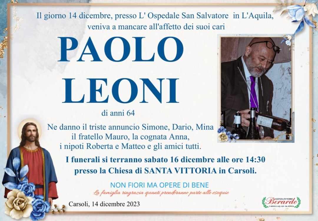 CARSOLI – Si sono svolte oggi pomeriggio alle ore 14.,30 le esequie del caro Paolo Leoni mancato prematuramente all’età di 64 anni. Tantissimi amici ed estimatori da ogni dove sono intervenuti a tributargli l’ultimo saluto presso la Chiesa Parrocchiale di Santa Vittoria a Carsoli. La sua scomparsa ha suscitato profondo cordoglio nel mondo dei sommelier della Fis della quale era un apprezzato componente. Viveva a Carsoli da alcuni anni, e si è sempre fatto apprezzare per la sua pacatezza, signorilità e propensione all’amicizia concreta. Una persona veramente per bene.