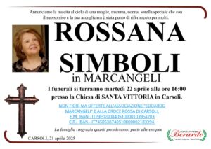 CARSOLI – Questa mattina alle ore 9.05 presso il Policlinico “Umberto I°” in Roma la cara Rossana Simboli in Marcangeli è passata all’eterna dimensione. Si ricongiunge nel mistero della fede al suo adorato nipote Edoardo, Angelo tra gli Angeli.