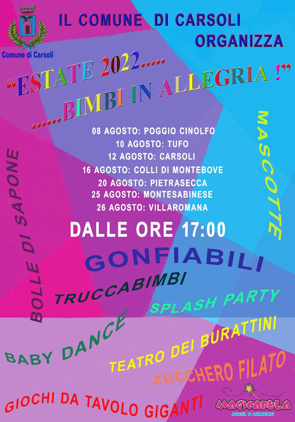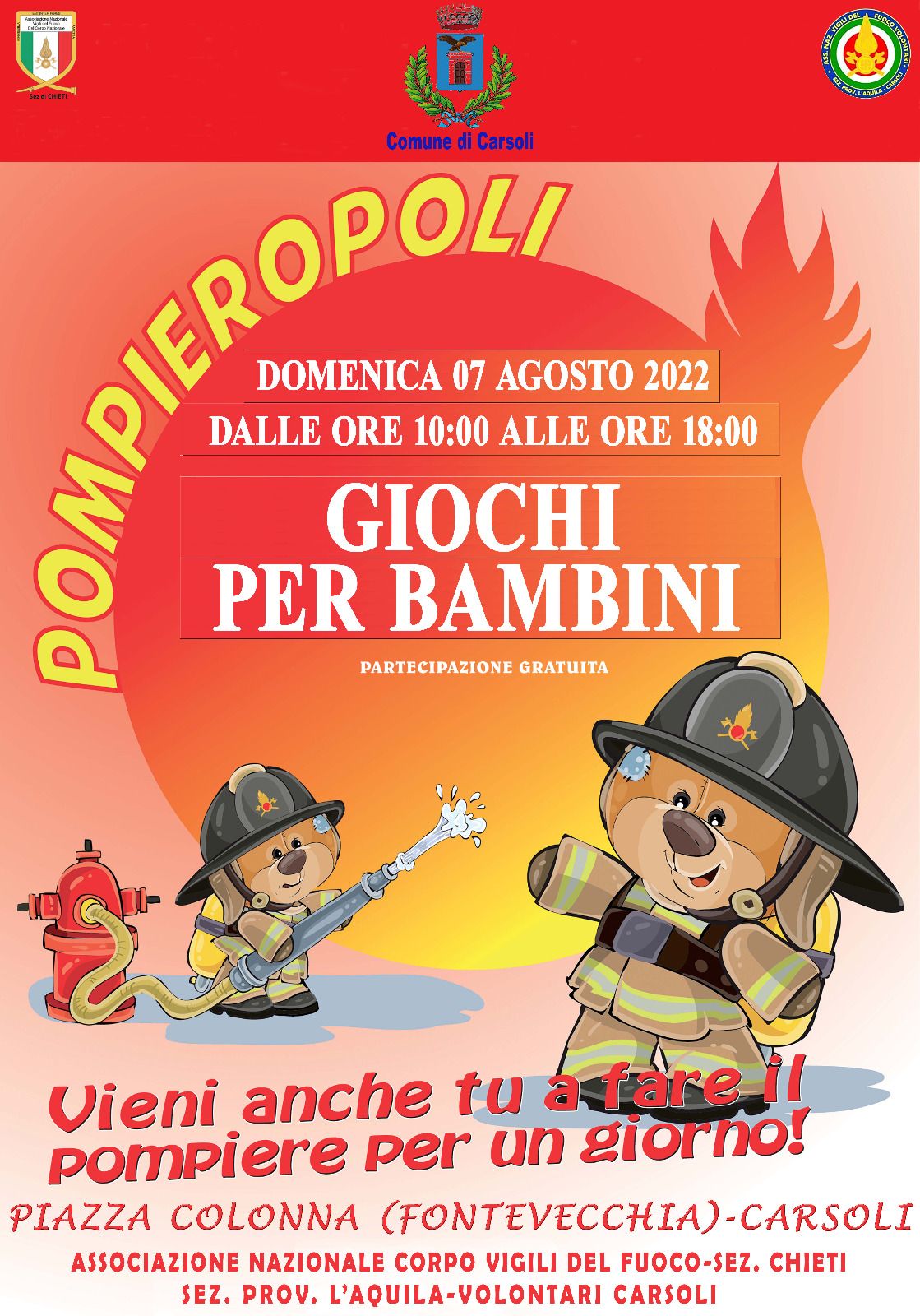 CARSOLI  – Importanti novità per i piu’ piccoli: a Carsoli arriva il mese dei bambini e con agosto molte sono le iniziative intraprese dal comune di Carsoli. Una serie di giornate con i gonfiabili itineranti che saranno allestiti sia nel capolugo ed anche in tutte le frazioni, e poi spazio a Pompieropoli che torna dopo la riuscitissima edizione del 2019.