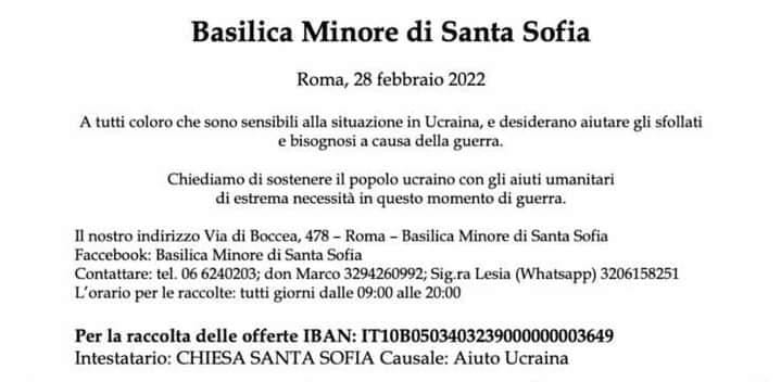 ROMA – Per portare aiuto ai profughi ucraini riportiamo tutti gli estremi e contatti necessari con la Basilica di Santa Sofia in Roma: