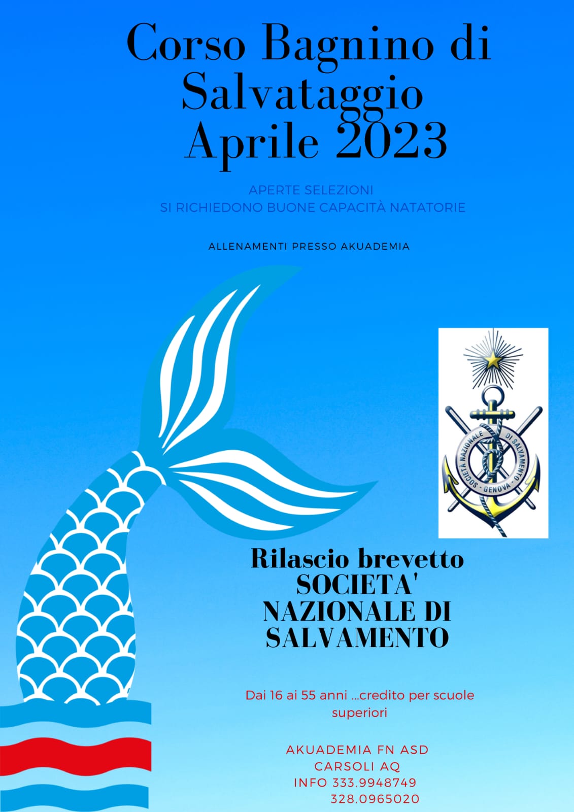 CARSOLI – Nuove ed importanti opportunità con Akuademia a Carsoli con la partenza del secondo corso di Bagnino di Salvataggio con rilascio brevetto della SOCIETÀ NAZIONALE DI SALVAMENTO e con allenamento formativo in svolgimento presso la piscina Akuademia di Carsoli.