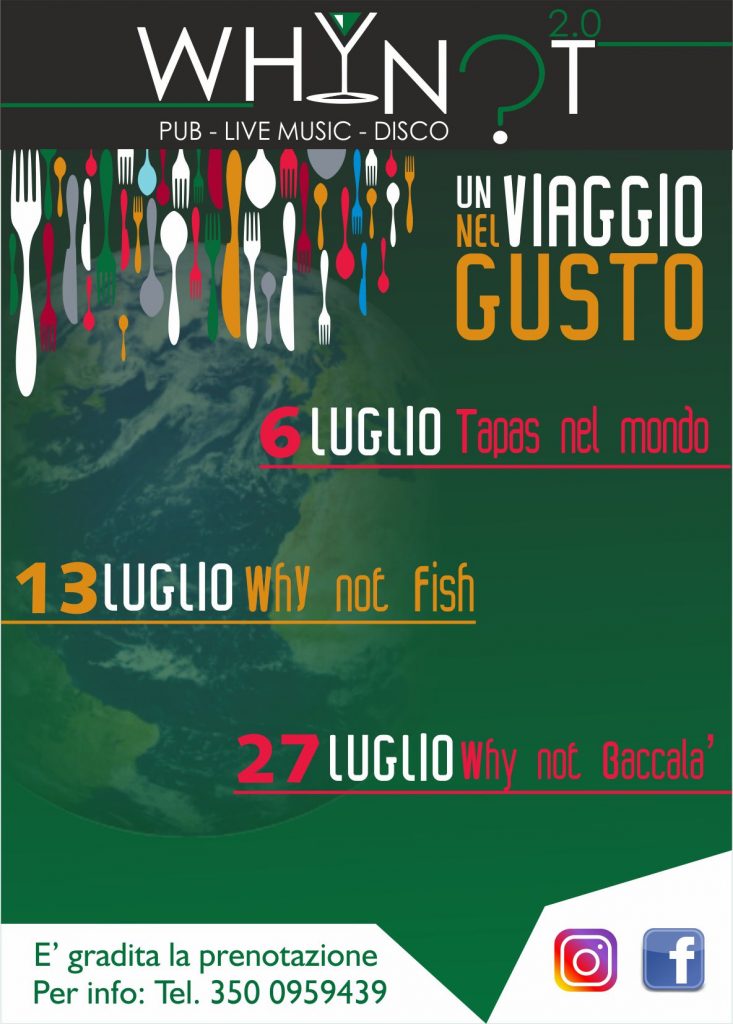 Carsoli – Gli eventi al Why Not 2.0 di Carsoli si caratterizzano per il mese di luglio con “Un viaggio nel gusto”. Tre serate a tema, si parte da sabato 6 luglio con Tapas nel mondo, per poi proseguire sabato 13 con Why Not fish, ed il 27 con Why Not Baccalà. Eventi imperdibili, per celebrare il gusto nel cuore della bella estate.