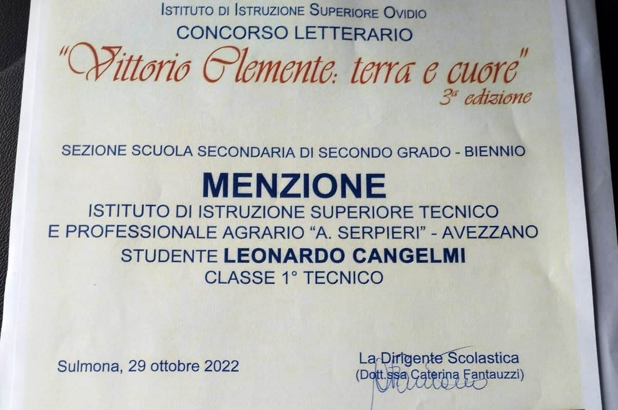 CARSOLI – Menzione speciale per il nostro Leonardo Cangelmi, della classe 1 A T dell’istituto Arrigo Serpieri di Avezzano, per aver partecipato alla terza edizione del premio “Vittorio Clemente – terra e cuore” . Il concorso letterario, promosso dal polo liceale Ovidio di Sulmona, in collaborazione con la famiglia Tataseo in memoria del poeta Vittorio Clemente, originario di Bugnara, ha visto la partecipazione di numerose scuole abruzzesi.