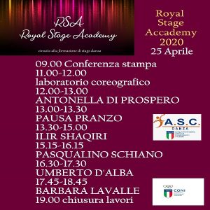Arriva in Abruzzo il ROYAL STAGE ACADEMY 2020, che si svolgerà a Carsoli il 25 ed il 26 Aprile. Un Weekend di circuiti di danza, di alta formazione, con i maestri ILIR SHAQIRI, ANDREA SCAZZI, PASQUALINO SCHIANO, CRISTINA PITRELLI, BARBARA LAVALLE, ANTONELLA DI PROSPERO. Il 25 Aprile dalle 09.00, ci sarà la conferenza stampa, in presenza di Sergio Pirozzi, ex sindaco di Amatrice, per parlare della situazione delle zone terremotate. Quest’anno, la RSA, ha voluto sottolineare l’evento con lo slogan IL CUORE DELLA DANZA BATTE PER AMATRICE. Saranno consegnante oltre 70 borse di studio, nazionali ed internazionali.L’evento è patrocinato dal CONI-ABRUZZO. Sono state accreditate le testate giornalistiche DANZASI, RADIODANZA, IL CAPOLUOGO, CONFINELIVE, IL FARO 24 NEWS. Contatti 3283116483, [email protected]. pagina facebook Royal Stage Academy. A tutti i partecipanti sarà rilasciato attestato.