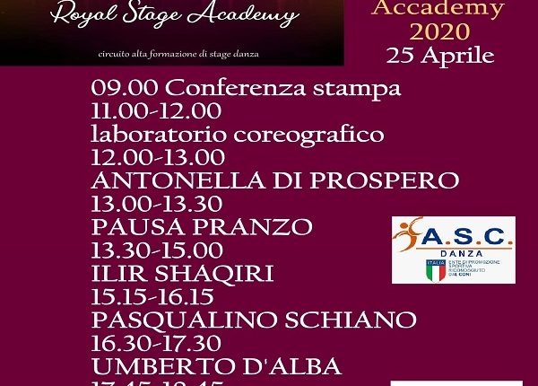 Arriva in Abruzzo il ROYAL STAGE ACADEMY 2020, che si svolgerà a Carsoli il 25 ed il 26 Aprile. Un Weekend di circuiti di danza, di alta formazione, con i maestri ILIR SHAQIRI, ANDREA SCAZZI, PASQUALINO SCHIANO, CRISTINA PITRELLI, BARBARA LAVALLE, ANTONELLA DI PROSPERO. Il 25 Aprile dalle 09.00, ci sarà la conferenza stampa, in presenza di Sergio Pirozzi, ex sindaco di Amatrice, per parlare della situazione delle zone terremotate. Quest’anno, la RSA, ha voluto sottolineare l’evento con lo slogan IL CUORE DELLA DANZA BATTE PER AMATRICE. Saranno consegnante oltre 70 borse di studio, nazionali ed internazionali.L’evento è patrocinato dal CONI-ABRUZZO. Sono state accreditate le testate giornalistiche DANZASI, RADIODANZA, IL CAPOLUOGO, CONFINELIVE, IL FARO 24 NEWS. Contatti 3283116483, [email protected]. pagina facebook Royal Stage Academy. A tutti i partecipanti sarà rilasciato attestato.