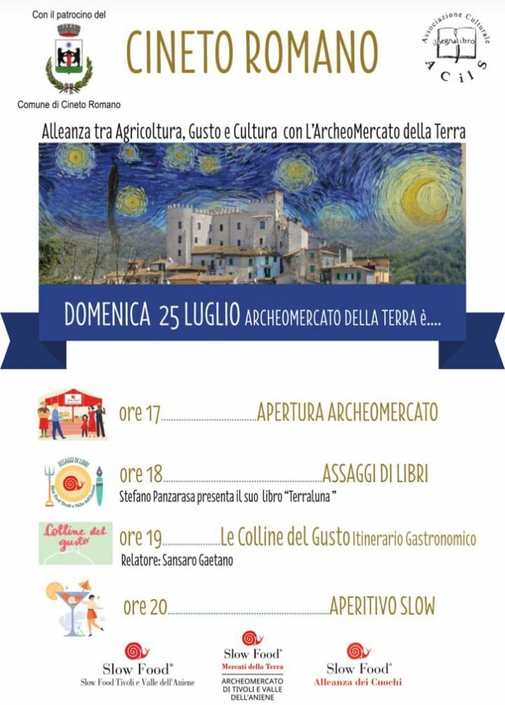 Cineto Romano – Grande attesa a Cineto Romano per la seconda giornata dedicata all’archeomercato. L’appuntamento è per Domenica 25 Luglio 2021 per un evento in grande stile organizzato da Slow Food Tivoli e Valle dell’Aniene. Questo il programma: Dalle ore 17 Apertura archeomercato della terra. Alle ore 18 “Assaggi di libri” con la presentazione del libro “Terraluna’ di Stefano Panzarasa. Alle ore 19 ” le colline del gusto” a cura di Sensaro Gaetano. Dalle ore 20 Aperitivo Slow Per tutta la giornata sarà possibile visitare il monumento naturalistico delle cascate di Rio Scuro e percorso Coleman