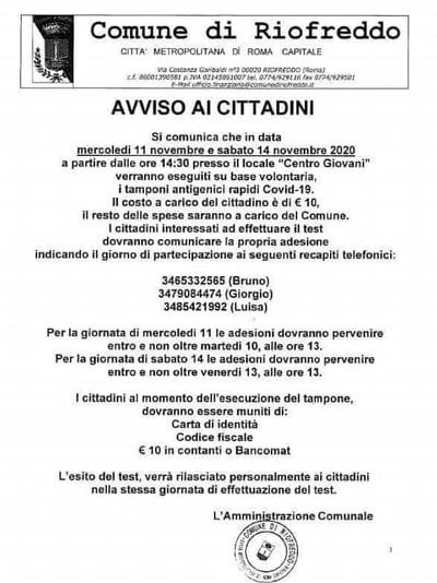 Al via a Riofreddo la due giorni di test antigenici rapidi Covid 19