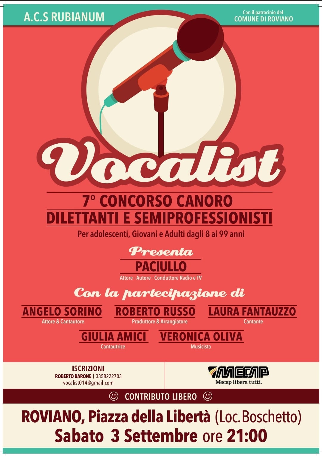 ROVIANO – Count down per un evento particolarmente atteso a Roviano: la settima edizione di Vocalit, il concorso canoro per dilettanti e semiprofessionisti che si svolgerà il prossimo sabato 3 settembre 2022 in piazza.