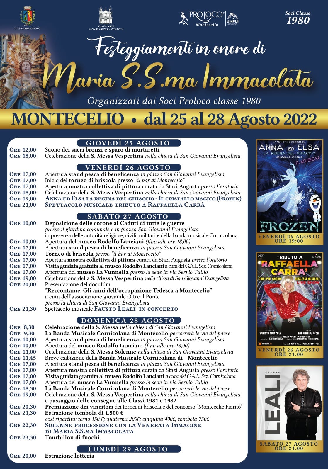 In occasione dei festeggiamenti in onore di Maria SS Immacolata, che si terranno a Montecelio dal 25 al 28 agosto 2022 in piazza San Giovanni Evangelista e piazza Bruno Buozzi, e considerato che il 28 agosto 2022 si svolgerà la Processione – che partirà dalla Chiesa di San Giovanni Evangelista e percorrerà piazza San Giovanni Evangelista, via Monte Albano, via XXV Aprile, via Monte Albano, piazza San Giovanni Evangelista per poi rientrare nella Chiesa – si è reso necessario disciplinare il transito e la sosta dei veicoli e velocipedi nelle vie e piazze del Comune come di seguito riportato: