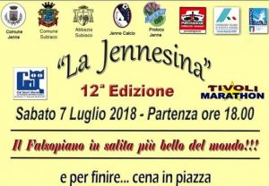 Jenne – C’è grande attesa per sabato 7 luglio 2018, quando alle ore 18.00 ai nastri di partenza ci sarà la dodicesima edizione de “La Jennesina”, un evento unico nel suo genere che vede protagonista il falsopiano in salita più bello del mondo, con panorami mozzafiato, ambiente, sport, e tanta convivialità da trascorrere insieme. L’evento è patrocinato dal Comune di Jenne, Subiaco, l’Abbazia di Subiaco, Jenne calcio, la Pro-Loco di Jenne e curato da organizzazioni podistico-sportive tra le quali l ’Associazione Sportiva Dilettantistica Tivoli Marathon. La gara è inserita nel circuito gare “cortocircuitorun”. L’Associazione Sportiva Dilettantistica Tivoli Marathon.