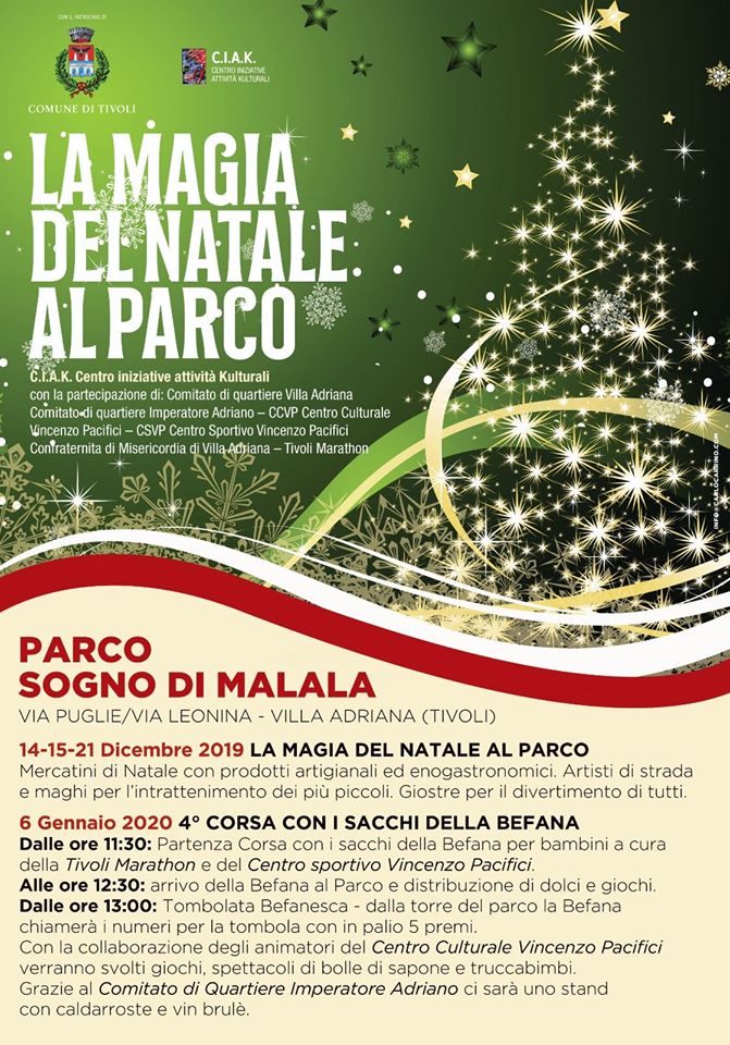 Villa Adriana – Una serie di eventi ed iniziative tutte da vivere in convivialità e clima di festa. Tre appuntamenti in sequenza caratterizzano “La magia del Natale al Parco”, il 14, 15 e 21 dicembre con mercatini e giochi di intrattenimento. Poi spazio alla Befana e con la quarta corsa dei sacchi, tombolate, arrivo della befana per la gioia di grandi e piccini.