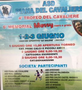 Carsoli – Sesta edizione per il memorial “Massy cuore e grinta”. In ricordo di Massimiliano Nitoglia, quest’anno ci sarà una tregiorni di gare calcistiche disputate presso il Centro Sportivo “Le Salere” di Oricola. Il calcio d’inizio sarà venerdì 1° giugno alle ore 15.00 con l’apertura ufficiale del memorial con l’apertura del torneo categoria “Primi Calci e piccoli amici”, mentre il 2 giugno intera giornata con gli esordienti ed il 3 con i giovanissimi. La premiazione del torneo a conclusione del memorial si svolgerà domenica 3 alle 17.30 Una nuova occasione per rendere viva la memoria di Massimiliano, amante dello sport, dell’amicizia e della convivialità. Queste le squadre in campo: