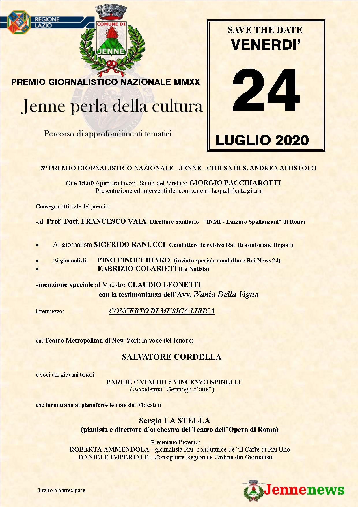Jenne – Il Comune di Jenne, nell’ambito delle attività di natura culturale legate al progetto “Jenne perla della cultura” organizza per il 2020 la terza edizione del Premio Giornalistico Nazionale.
