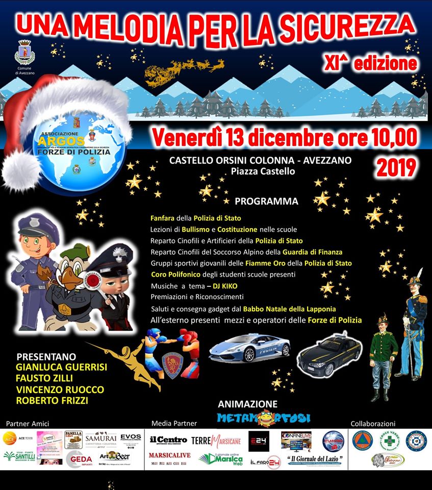 Redazione – C’è grande attesa ad Avezzano per l’undicesima edizione della kermesse natalizia più attesa dell’anno, Una Melodia per la Sicurezza. L’evento in grande stile ad Avezzano (Aq) presso la splendida cornice del Castello Orsini Colonna. Una manifestazione che si preannuncia ancora più ricca delle precedenti, quelle romane, che comunque hanno segnato un grande successo di pubblico presente e tanto divertimento per grandi e piccoli.