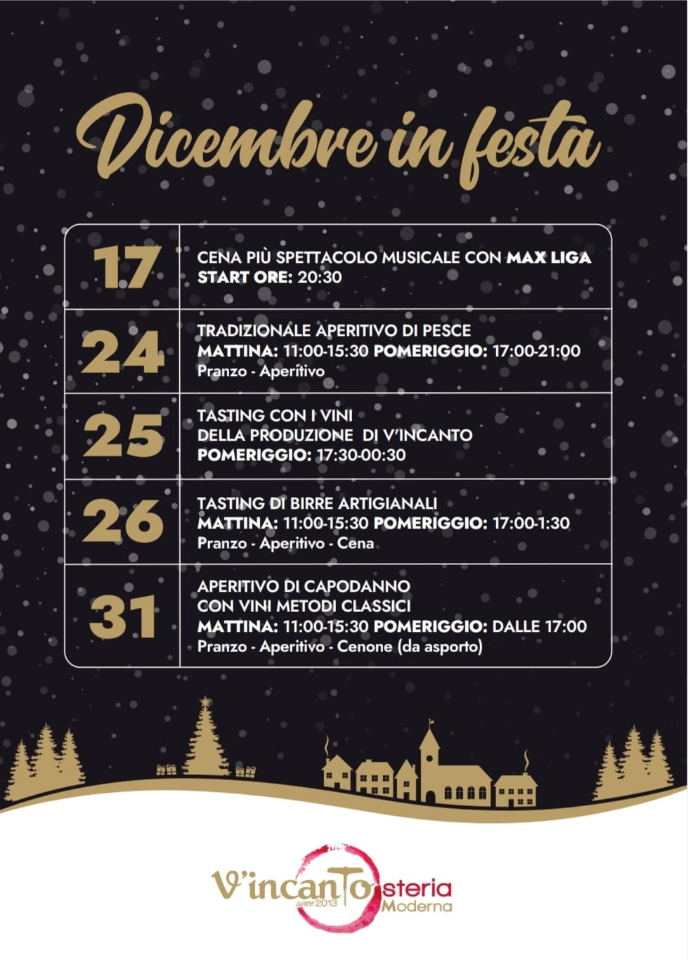 CARSOLI  – Si apre il calendario delle iniziative ed eventi al V’Incanto Osteria Moderna di Carsoli. Feste dunque tutte da vivere nella finalmente ritrovata normalità. Spazio dunque al gusto, alla convivialità per vivere insieme un periodo magico, che finalmente consente di stare liberamente insieme. “Il Dicembre sarà veramente in festa – spiega l’owner Daniele Berardini – quest’anno faremo le cose in grande: tante occasioni ben organizzate per divertirsi in musica. E quindi… vi aspettiamo” .