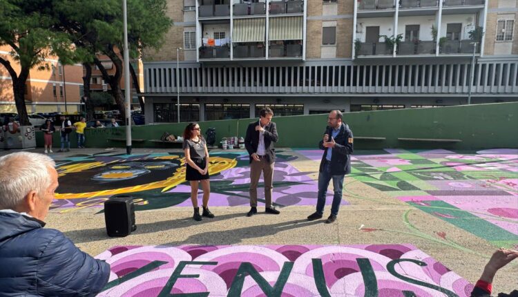 Roma  – Emozioni ieri  alla Magliana dove è stata inaugurata piazza Fabrizio De André  con tre giganteschi murales pavimentali. FLASH