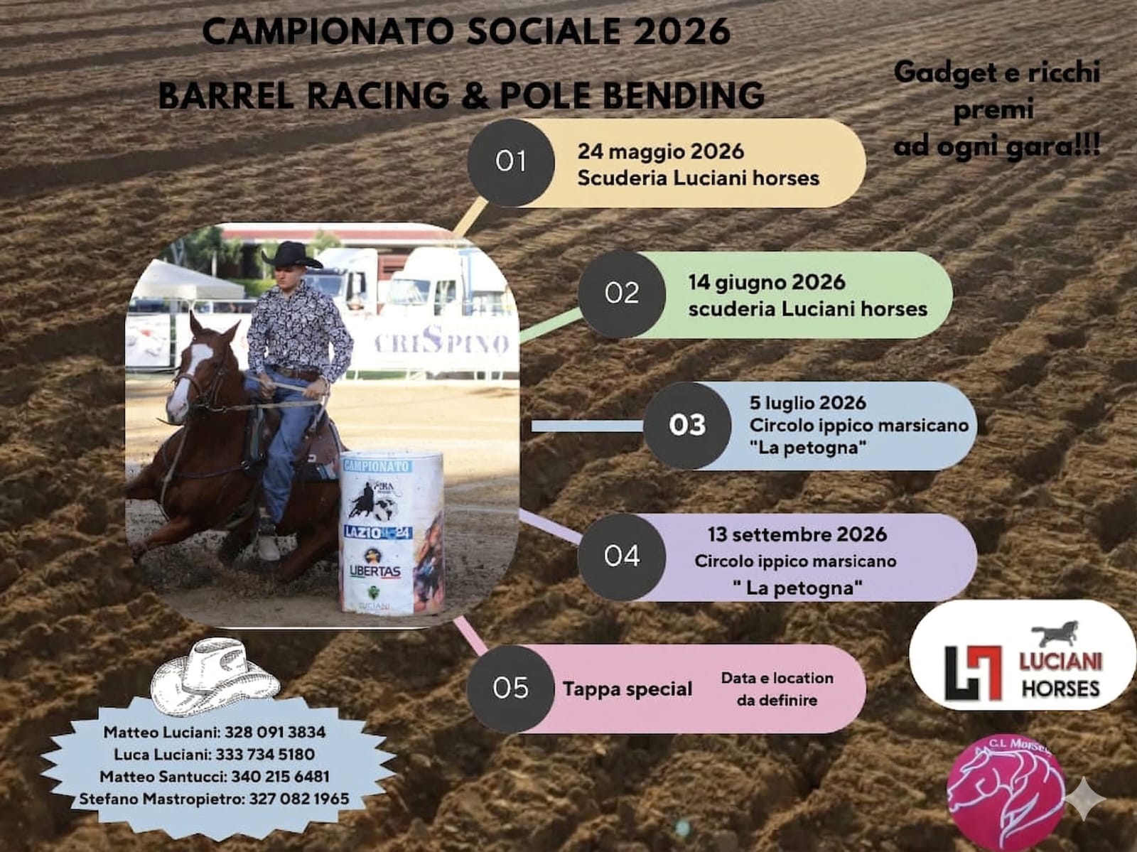 ORICOLA (AQ) – Cresce l’attesa per il Campionato Sociale 2026 di Barrel Racing & Pole Bending, che prenderà ufficialmente il via il prossimo 24 maggio con la prima tappa ospitata dalla Scuderia Luciani Horses. Un appuntamento molto atteso dagli appassionati della monta western, che promette spettacolo, competizione e premi in ogni gara.
