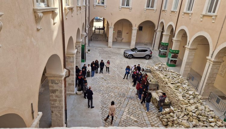 Accolti nell’ampio cortile, studenti e insegnanti hanno preso parte alla visita guidata ripercorrendo le tappe storiche dell’edificio, in origine Palazzo del Capitano, poi divenuto sede di Margherita d’Austria, Palazzo di Giustizia e infine sede del Comune dell’Aquila.